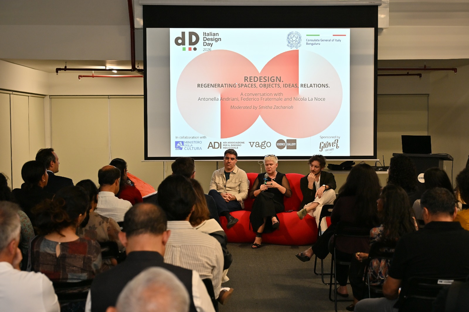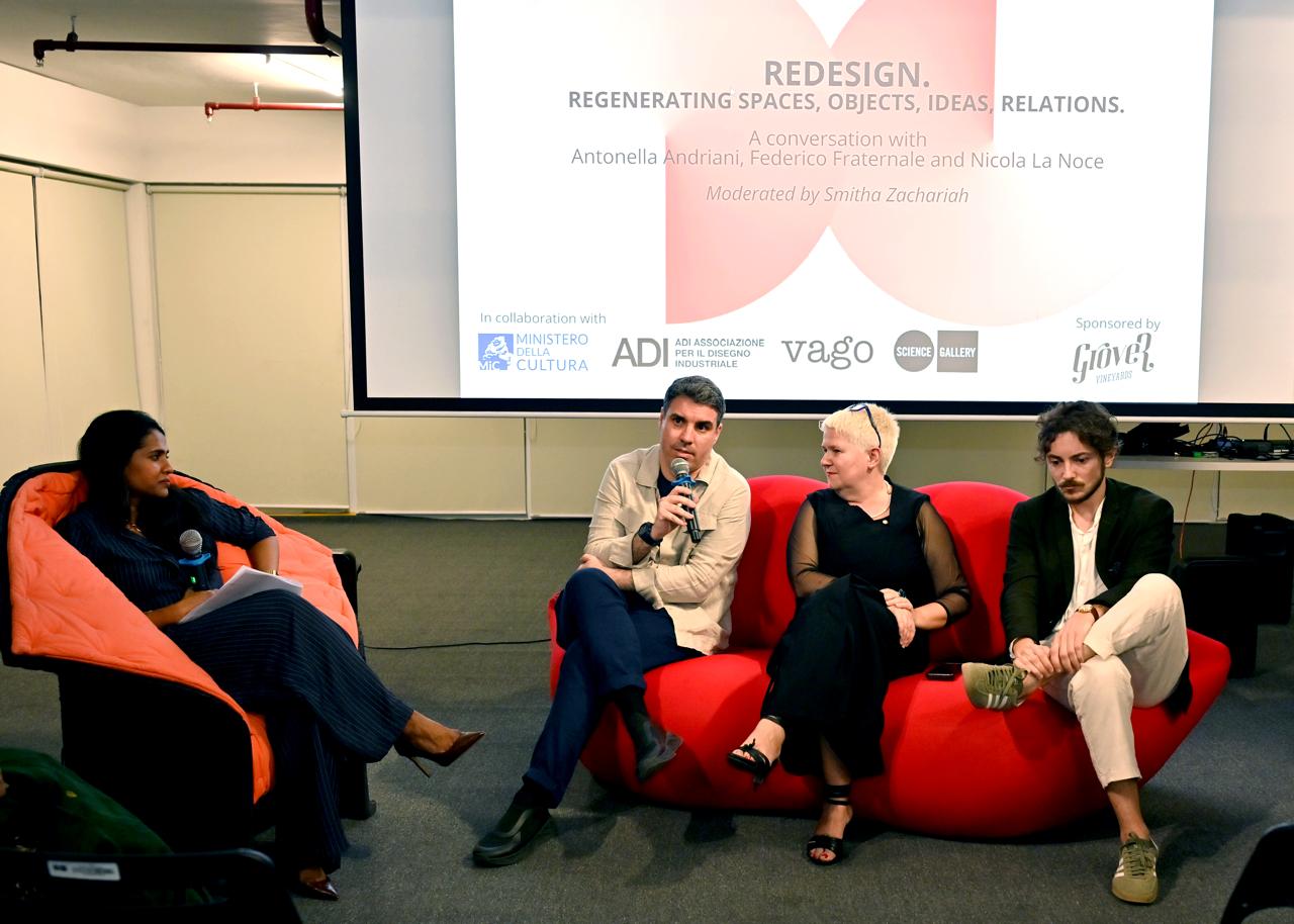 Il programma è proseguito in serata presso la Science Gallery Bengaluru con una tavola rotonda alla quale hanno preso parte Antonella Andriani; Federico Fraternale, designer e cofondatore di Taro Studio e Taro Collective; e Nicola La Noce, architetto e cofondatore di Kumar La Noce. L’incontro è stato moderato da Smitha Zachariah, fondatrice di SZ Design.